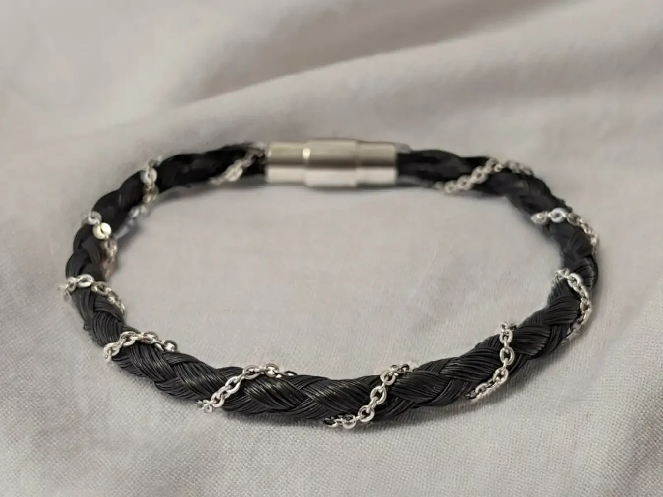 Das Armband aus Pferdehaar wird kunstvoll mit einer hochwertigen Edelstahlkette umwickelt und vereint rustikale Natürlichkeit mit modernem Chic.